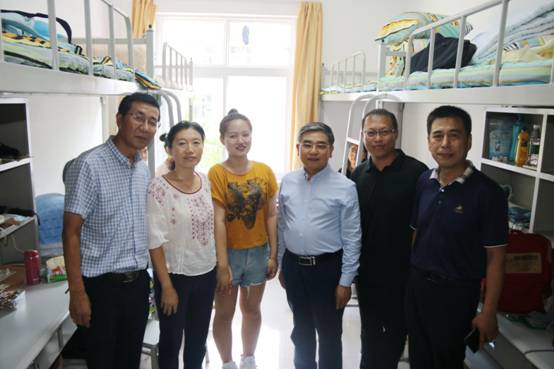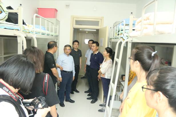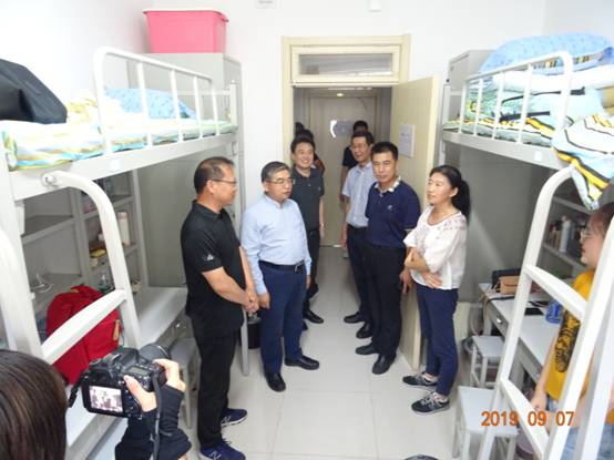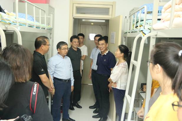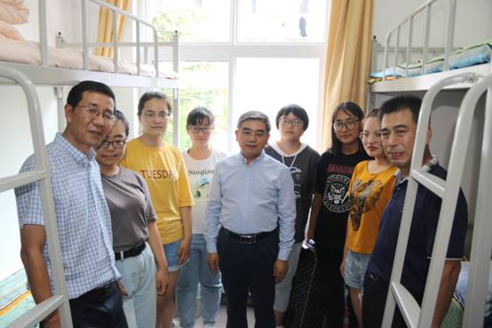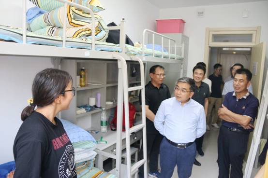 为进一步掌握新生入住宿舍的具体情况,亲近学生、关心学生,让新生感受到学校领导、老师们对他们的关心与关怀,校党委书记胡金焱于2019年9月7日下午15:00时,在太阳网集团tcy8722党委书记赵连章、院长张晓东及学院各职能部门相关负责人的陪同下,走访了我院19级新生寝室。