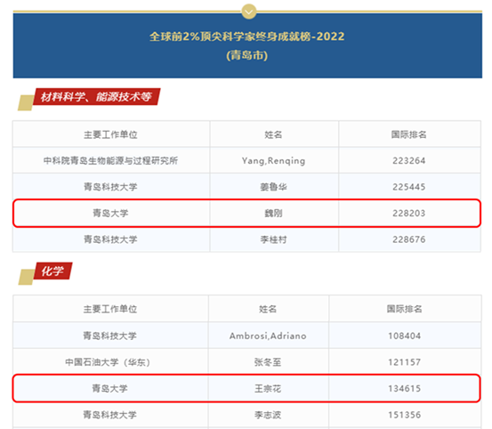 近日,由斯坦福大学发布的全球前2%顶尖科学家榜单更新了2022年版本,我院王宗花教授(国际排名134615)、魏刚教授(国际排名228203)位列其中,两位教授分别在化学、材料科学领域做出了突出贡献。