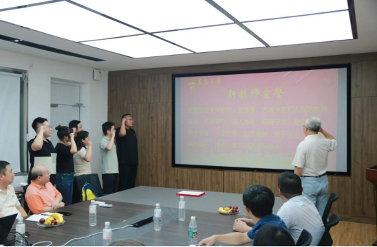 在随后举行的新教师入职仪式上,张吉平老师带领新入职教师进行庄严宣誓,铮铮誓言既是对教师职业的坚定信念,也是对化院人教育精神的一脉相承。大家纷纷表示要自觉肩负起教师的光荣使命,立足教书育人的本职工作,创新传道授业的教育实践,立德树人,为国家的教育事业和学校的发展做出应有的贡献。