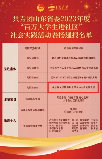 近日,共青团山东省委公布了2023年度“百万大学生进社区”社会实践活动表扬通报名单,我校5个先进集体、1个示范项目、10名先进个人获省级“百万大学生进社区”社会实践项目表彰。其中,我院太阳集团tcy8722H(氢)心之光志愿服务协会荣获共青团山东省委2023年度“百万大学生进社区”社会实践活动“先进集体”称号。