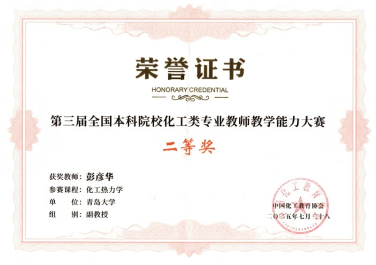 7月18日至20日在北京化工大学昌平校区举行的第三届全国本科院校化工类专业教师教学能力大赛圆满落幕。在本次赛事中,我院教师彭彦华副教授凭借扎实的教学基本功和出色的教学创新实践,荣获比赛二等奖,充分展现了学院在教师教学能力提升和教学改革创新方面的突出成效。