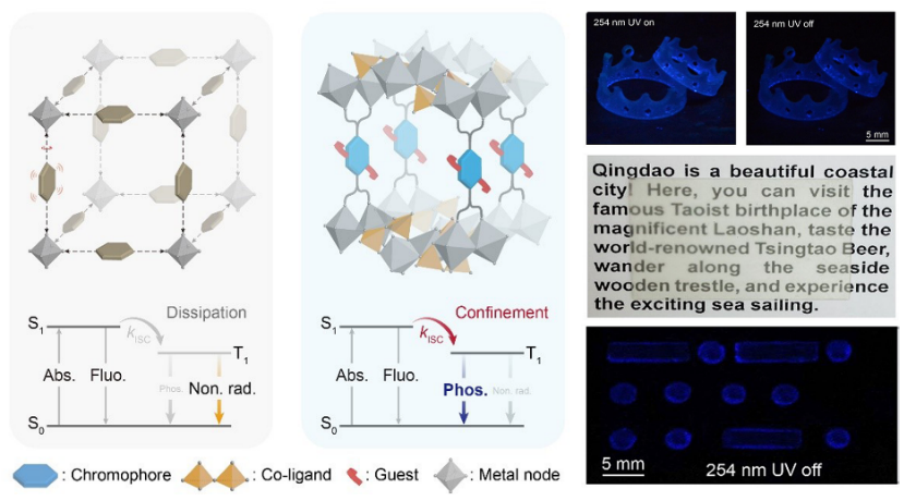 室温磷光材料在显示照明、生物成像、信息安全等领域应用广泛。目前开发的室温磷光材料家族中,磷光颜色主要集中在黄绿色区且磷光量子效率较低。针对这一前沿难题与研究瓶颈,王国明教授提出“以金属有机骨架为模型的配体功能化”组装设计策略,通过结构设计构建出金属膦盐杂化层作为辅助,诱使发光配体呈现单分散态,调控材料的发光颜色蓝移;在此基础上,通过配位“锚定”和主客体作用“协同”限制发光配体分子的振动转动,达到提高材料磷光量子效率的目标,本研究报道的室温磷光材料具有高达80.6%的蓝色磷光量子效率及长达169.7 ms的寿命。这为设计、合成高效RTP材料提供了普适性原理,也赋予了传统金属有机框架材料新的应用潜力,制备的新材料可应用于3D打印技术、高端防伪和指纹可视化等方面。