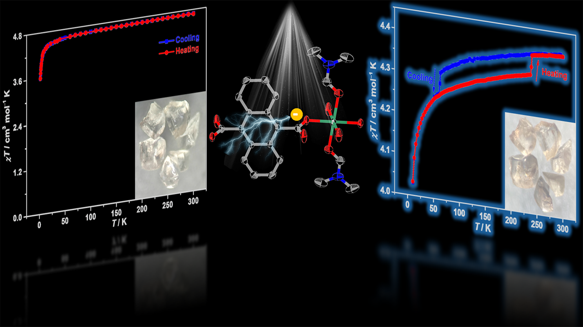 磁性双稳态多功能材料在分子开关、传感与信息存储等领域具有重要应用。迄今如何实现具有巨大热滞行为的磁双稳态调控仍然是材料科学中的重大挑战。王国明教授团队在前期光致变色材料研究基础上,设计蒽二甲酸分子作为光活性组分、过渡金属Mn2+离子作为自旋载体,成功组装出优异光致变色功能新材料。光照能够实现这类材料的磁结构由单离子单链构型转变,自由基与顺磁金属产生磁耦合作用变化,并诱导产生带有热滞回线的磁双稳态现象。该研究工作首次在自由基驱动的光致变色材料中实现了巨大热滞回线的磁双稳态,也是迄今为止稳定双稳态磁性体系中热滞回线最宽的一例。