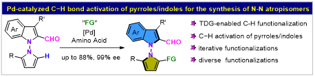 过去几十年,轴手性化学迎来快速发展,一系列具有C-C或C-N轴的轴手性骨架相继被发现并实现其不对称合成。然而,与之相对应的N-N轴手性长期以来一直没有引起化学家的重视。过渡金属催化不对称C−H官能团化是构建手性分子的重要策略之一,通过采用廉价易得的氨基酸作为瞬态辅基(TDG)策略来实现醛的不对称C-H活化,成为近年来最为成功的C-H活化策略之一。然而,目前该策略对于吡咯C−H键官能化构建轴手性化合物仍然是一个挑战。近日,太阳网集团tcy8722刘人荣团队通过TDG策略实现了钯催化吡咯2位C−H官能团化构建N-N轴手性,为N-N轴手性构建提供了一条新的高效路径。