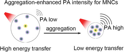 在本工作中,作者以经典的水溶性金属团簇Au25SR18(SR为硫醇)为例,发现加入弱极性溶剂诱导的金属团簇在水溶液中生成的聚集体的光声信号强度和光声转换效率明显高于单分散的金属团簇,而且信号强度和转换效率高度依赖于团簇的聚集程度,而聚集增强光声强度与团簇的配体密切相关。进一步的实验结果表明,聚集导致的团簇光声信号的增强是由于聚集体抑制了激发态团簇向周围介质分子的分子间能量转移过程,而非抑制了激发态团簇的辐射跃迁过程。该工作提出了一种增强金属团簇的光声信号的新策略,同时深入探讨了增强的光声能量的来源。这为新型金属团簇基的光声造影剂的开发提供了新的思路。