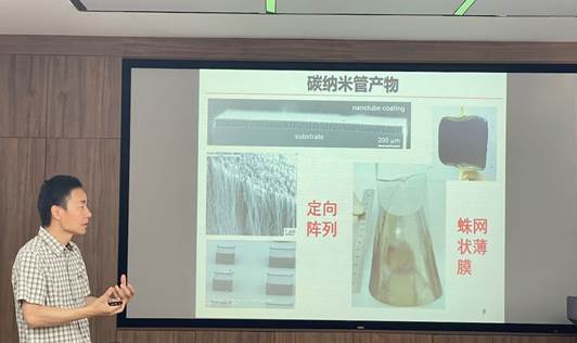 曹安源教授首先介绍了最新的研究进展,简单阐述了碳纳米材料的研究领域,接着详细介绍了他们课题组过去十几年中在碳纳米管材料及其功能复合材料等方面的研究成果。其中,最引人注目的是碳纳米管海绵的研究。三维多孔碳纳米管海绵具有非常高的比表面积和孔隙度,可以作为电极材料应用于储能器件中。曹安源教授介绍了课题组在该领域的研究工作,包括将活性物质或催化剂引入碳纳米管海绵中构建功能复合结构,并将其应用于超级电容器、钾离子、锂离子和锂硫电池等的电极材料,以及在碳纤维表面沉积碳纳米管海绵以增强碳纤维有机复合材料的界面。这些研究成果为未来能源存储和环保领域的发展提供了全新的思路和方法。