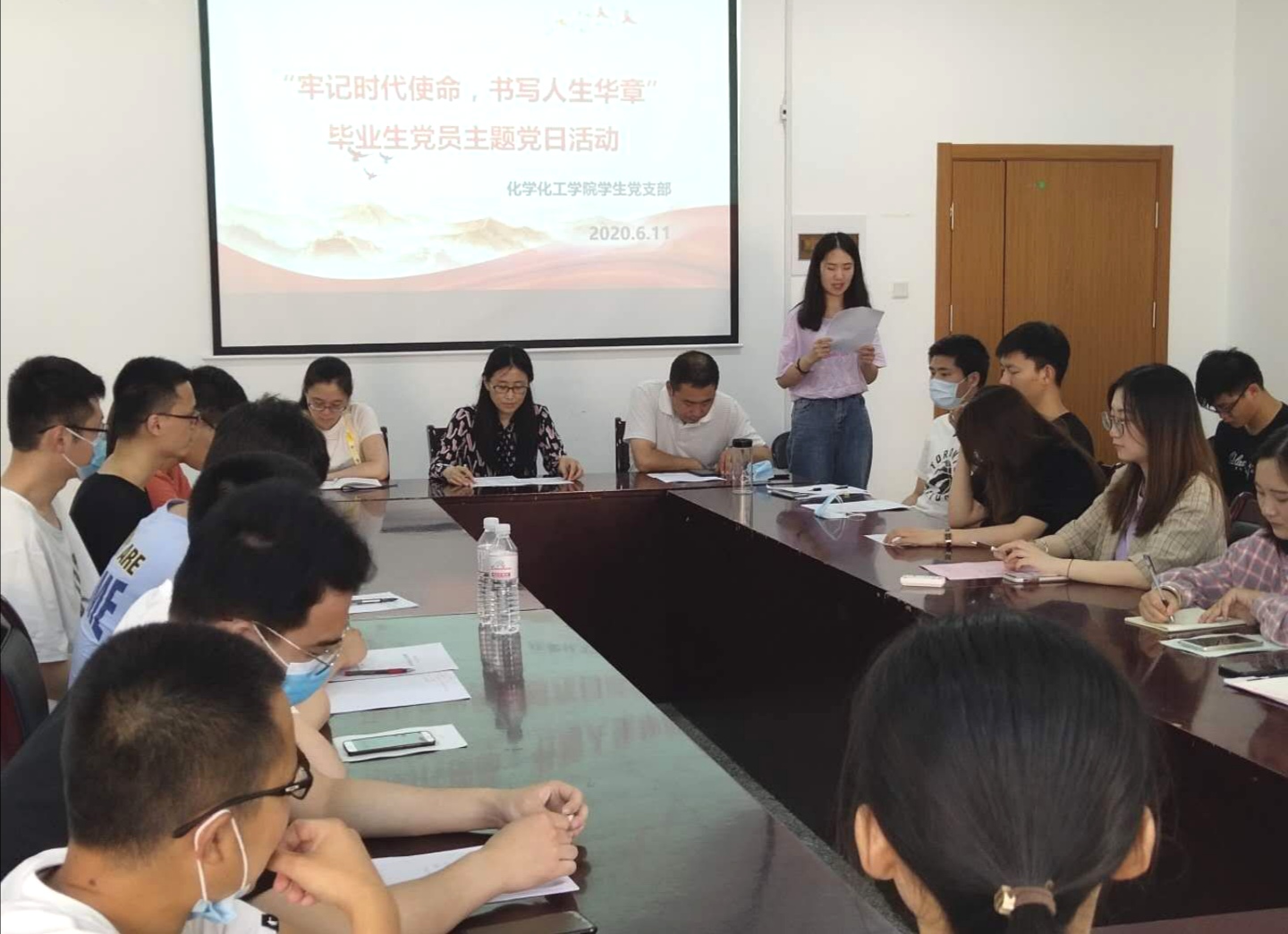活动伊始,付刚帮老师传达了《关于做好2020届毕业生党员离校有关工作的通知》精神,就组织关系转接总体原则、组织关系转接准备工作、组织关系转接具体流程,以及其他注意事项向全体毕业生党员作出了详细说明。随后,王鑫同志代表2020届毕业生党员发言,回顾大学四年的经历、展望未来可期的生活、铭记母校的师恩校训,同时代表全体毕业生党员做出庄严承诺,无论何时何地都会牢记党员身份,践行党的宗旨,不忘初心,笃志前行,在实现中华民族伟大复兴中国梦的实践中谱写人生华章。在张莹同志的带领下,与会党员面向党旗、举起右拳,重温入党誓词。
