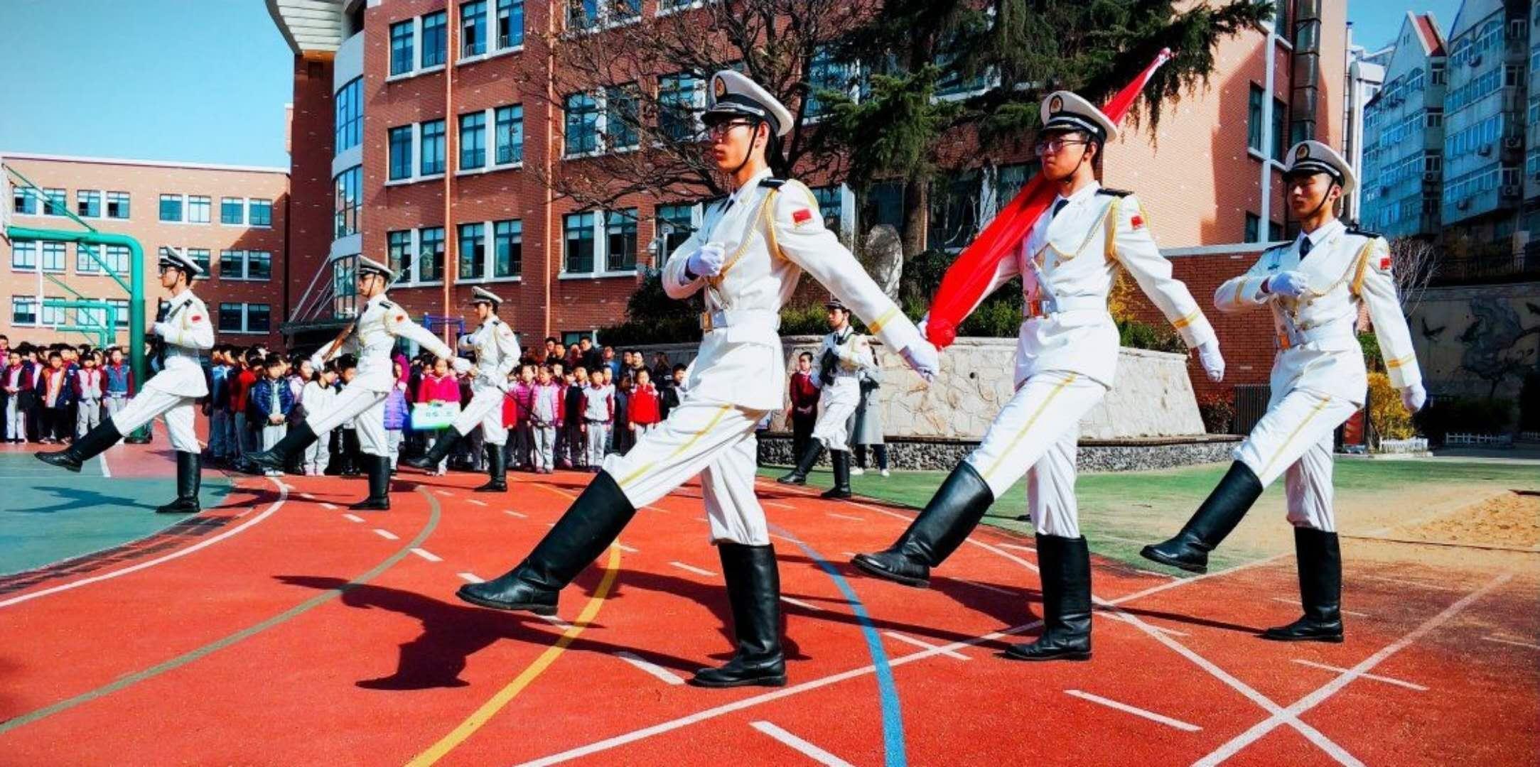 在全校师生热切的目光下,伴随着激昂的进行曲,国旗班队员以慷慨饱满的精神、整齐划一的步伐出旗。小学生们聚精会神地注视着队员们铿锵有力的步伐,被庄严的升旗仪式深深地吸引和震撼。在他们稚嫩而激动的国歌声中,五星红旗冉冉升起,全体师生向国旗行注目礼。