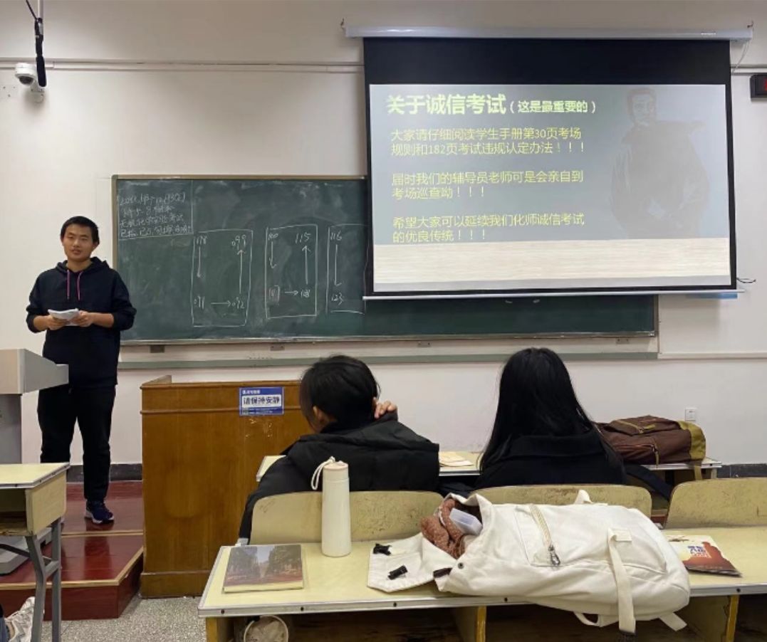 班会上各班班委向学生们讲述诚信考试的重要性,辅导员老师李林林结合《太阳集团tcy8722考试管理规定》和《太阳集团tcy8722考试违规认定办法》提醒学生们考试作弊的后果和危害,要求学生们严格要求自己,以饱满的姿态迎接期末考试。
