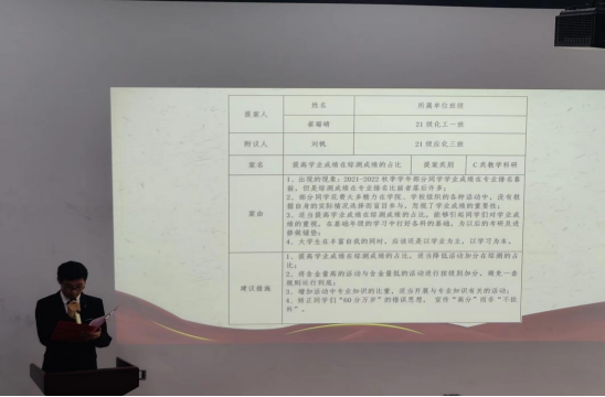在学生代表提案展示环节,第21届学生会生活权益中心负责人聂俊硕进行了学生提案工作汇报,并提交大会审议表决。大会筹备期间共征集提案25条,会议期间集中审议提案7条,内容涵盖校园文化类1条、教学科研类2条、公共服务类4条。经审议表决,七条提案全部通过,后期学院会积极联系相关部门,落实提案内容。