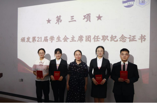 汇报结束后,院党委副书记李咏沙老师为第21届学生会主席团成员颁发任职纪念证书。百舸争流千帆竞,乘风破浪正远航,感谢第21届学生会全体成员的无私奉献。希望他们离任不离心,在个人学业和发展规划上继续发力,为全院同学做出表率!