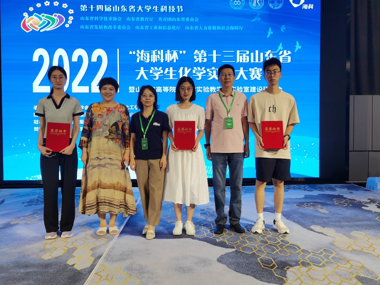 8月14日至17日,“海科杯”第十三届山东省大学生化学实验大赛暨山东省高等院校化学实验教学与实验室建设研讨会于烟台大学举行。学院马兆立、高翠丽和帅莉三位老师带队参赛,指导学生取得一等奖1项、二等奖2项的好成绩。